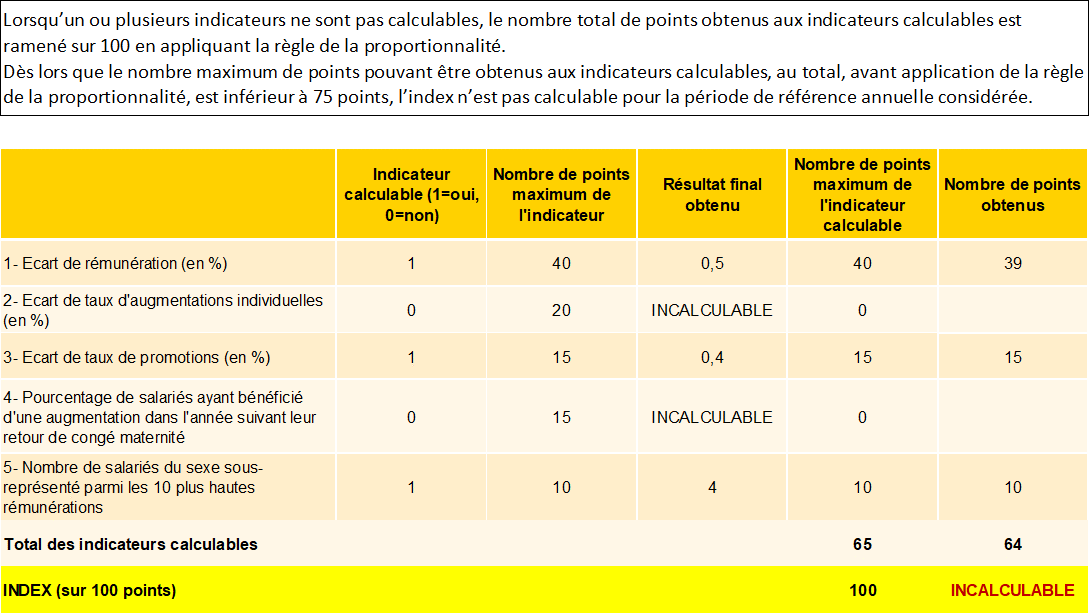 L’Index, sur 100 points, est composé de 4 à 5 indicateurs selon que l’entreprise a moins ou plus de 250 salariés :